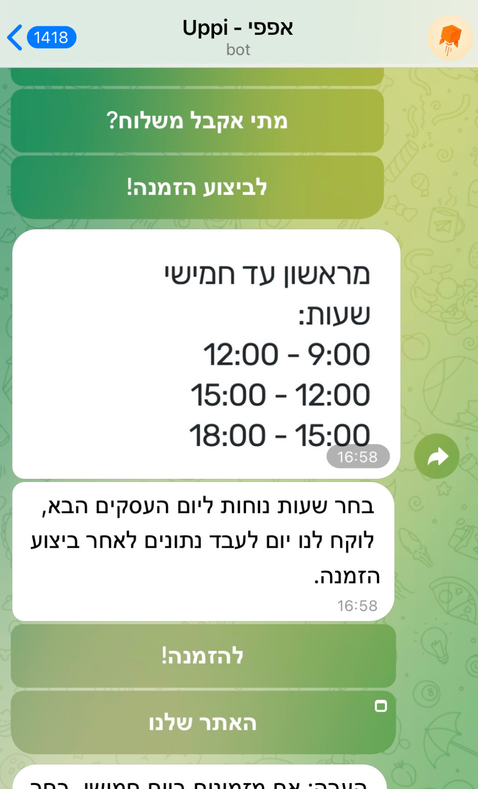 השירות שלנו מבטיח שהחבילה תגיע אליך במהירות האפשרית, ישירות לפתח הבית. עם ההזמנה דרך הבוטים שלנו באפליקציה שנוחה לכם, הכל קורה בלחיצת כפתור – פשוט, מהיר, ונוח.